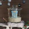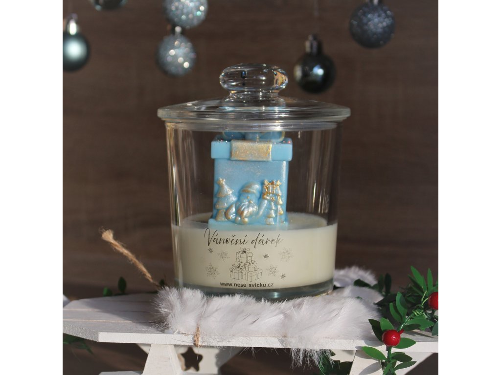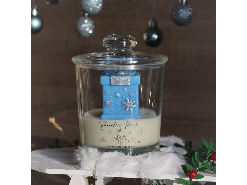 Průhledná sklenice ukrývá malý modrý dárek, který rozjasní prostor a přinese hravou eleganci do každého vánočního aranžmá.
